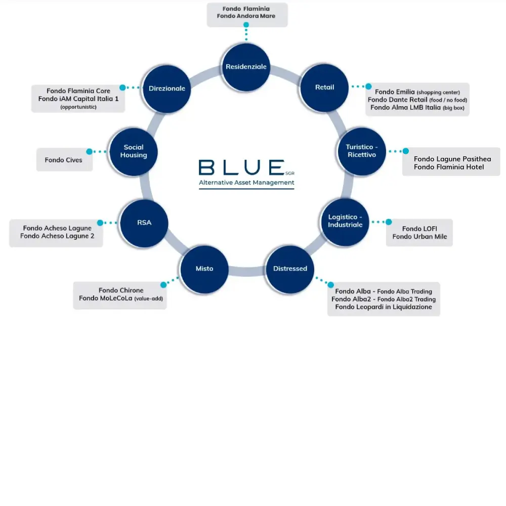 BLUE SGR currently consists of a specialised team of professionals with in-depth experience in the real estate sector and extensive knowledge of the national and international real estate market according to the main asset classes: